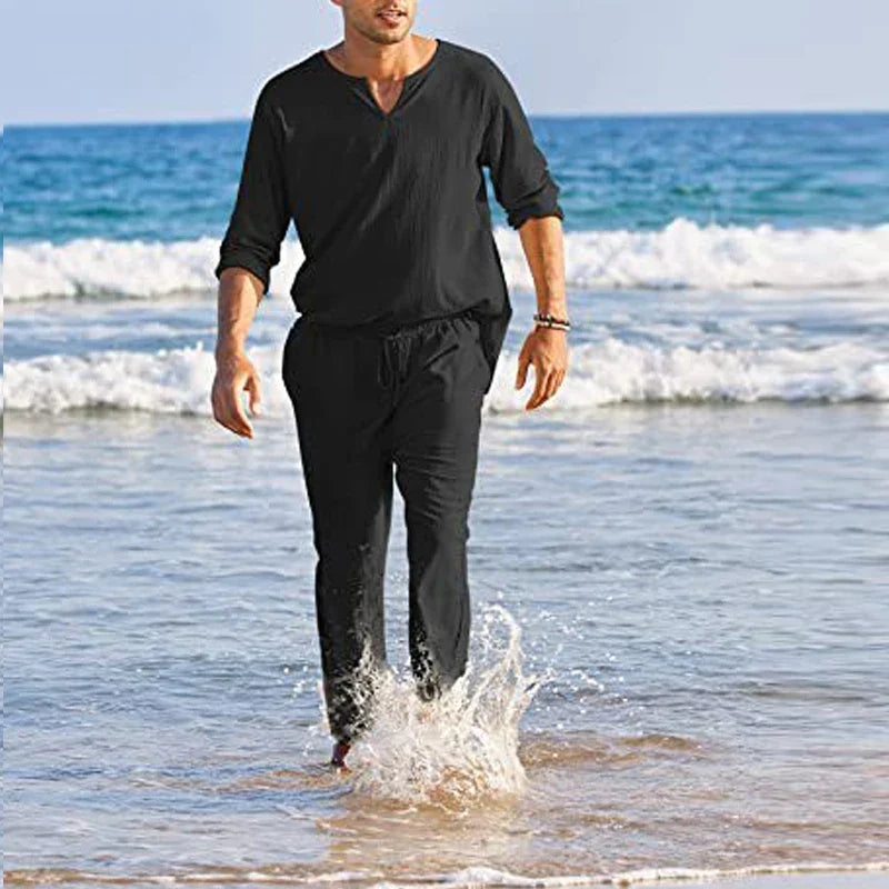 Passend zum Oberteil sind die Hosen aus dem gleichen hochwertigen Material gefertigt, um einen einheitlichen Komfort und Stil zu gewährleisten. Ein elastischer Bund mit verstellbarem Kordelzug sorgt für eine sichere und individuelle Passform und ermöglicht Flexibilität und einfaches Tragen. Die knöchellangen Hosen verleihen dem traditionellen Strandlook eine moderne Note.