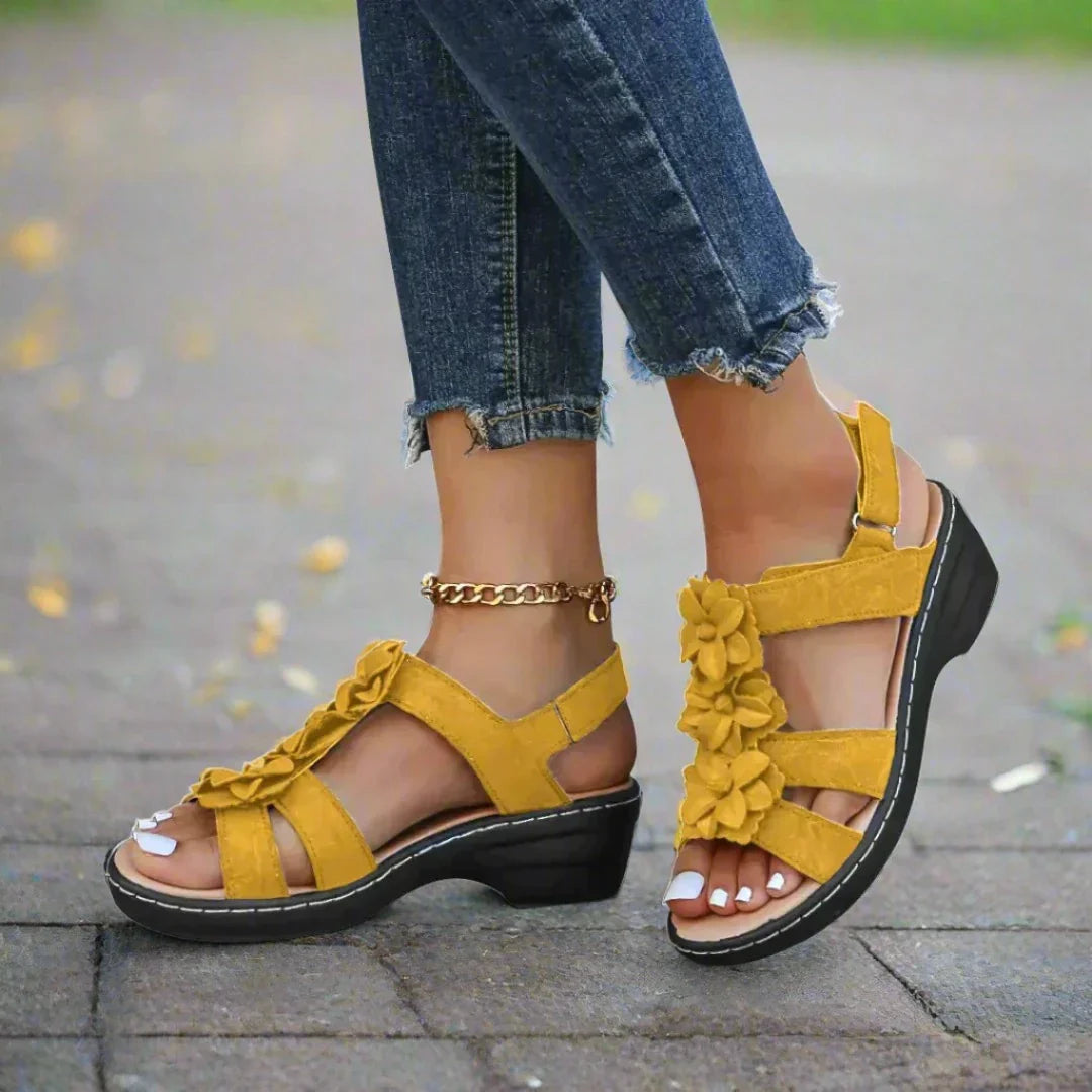 Erleben Sie sonnige Tage mit einem Hauch von Farbe und Stil mit unseren Boho-Chic Floral Platform Sandalen. Diese Sandalen zeichnen sich durch ein lebhaftes, senfgelbes Design und eine verspielte Blumenverzierung aus, die einen einzigartigen ästhetischen Touch bietet.