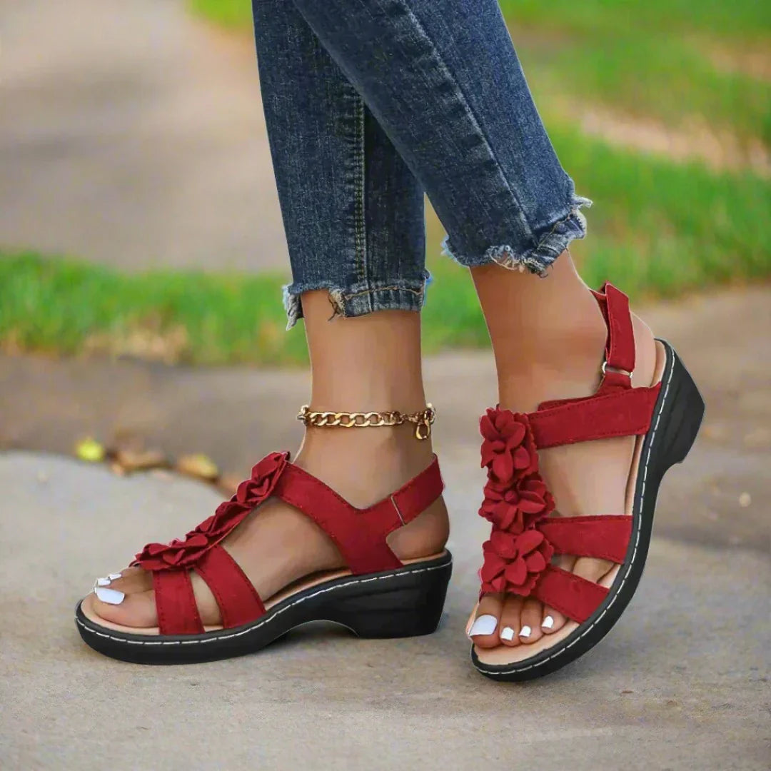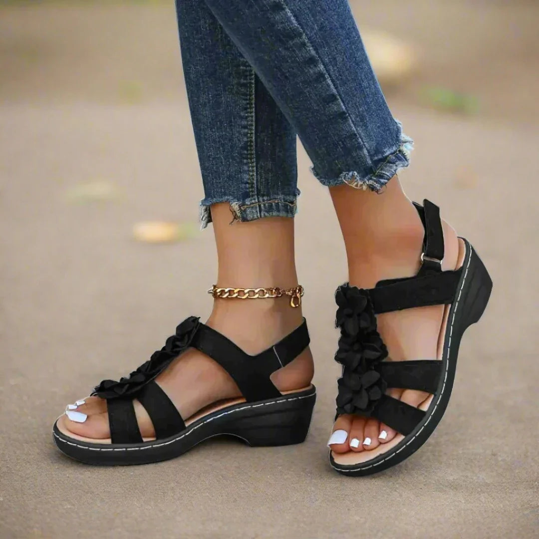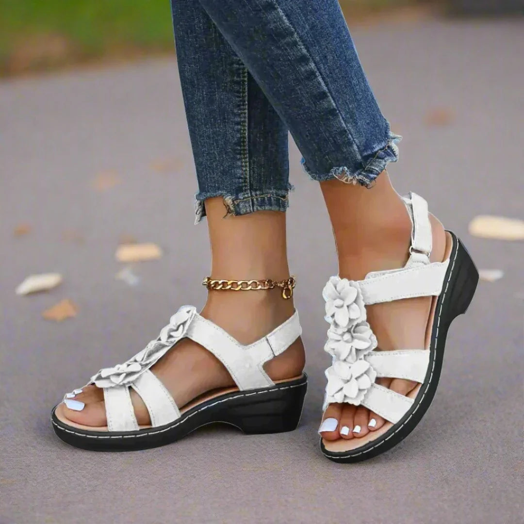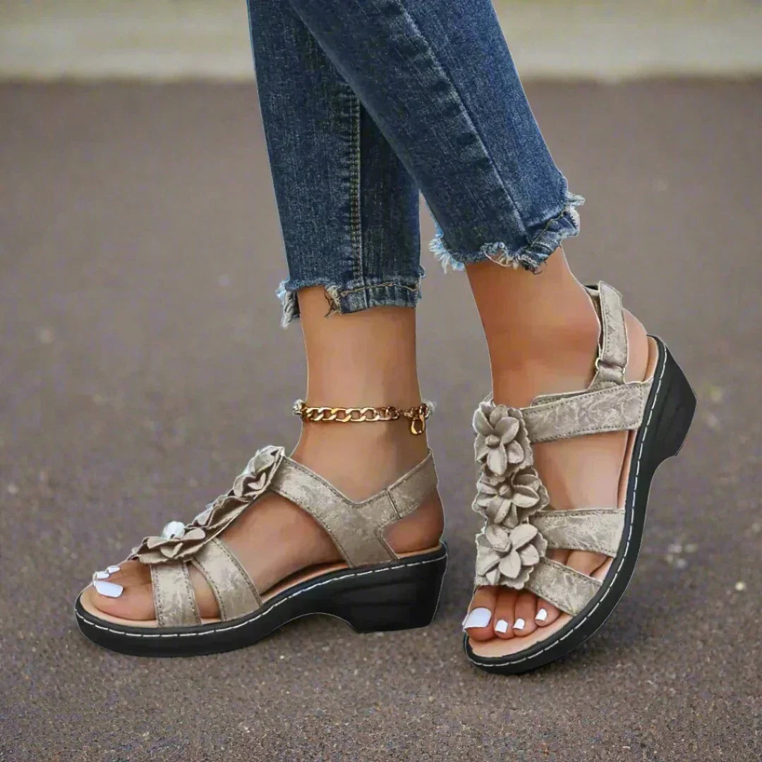 Die wichtigsten Merkmale sind ein auffälliges Obermaterial, eine zarte Blumenapplikation entlang des Riemens für einen femininen und trendigen Bohemian-Vibe, eine verstellbare goldfarbene Knöchelkette für eine individuelle und sichere Passform und eine stützende Plateausohle, die sowohl Höhe als auch Komfort bietet.