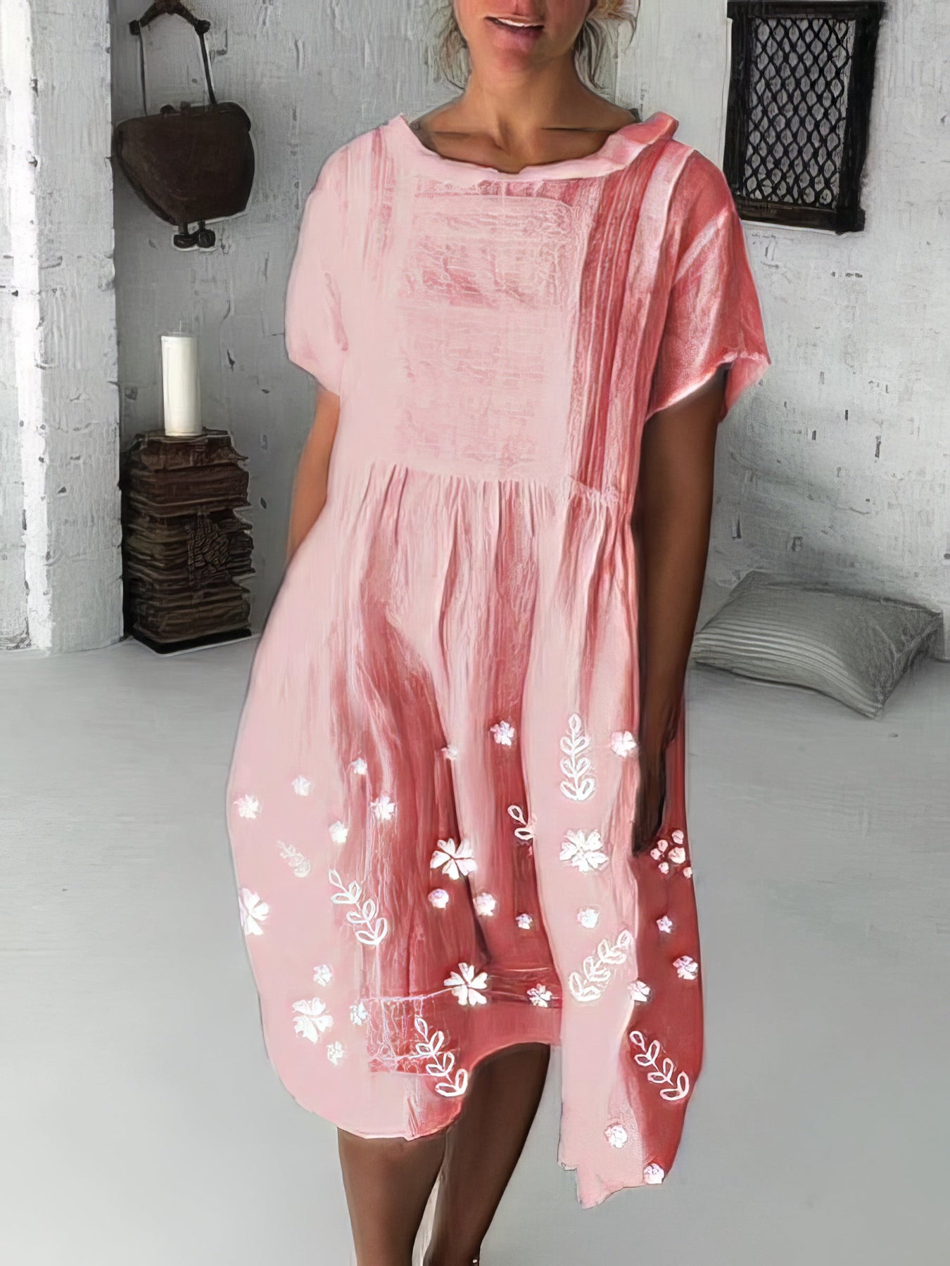 Die Hauptmerkmale sind das weiche pastellblaue Gewebe, verziert mit verspielter weißer Blumenstickerei für einen frischen, luftigen Look. Das knielange Design ist vielseitig für den Tages- und Abendentspannung geeignet. Kurze, sanfte Puffärmel verleihen einen subtilen romantischen Flair, während der breite, abgerundete Ausschnitt für eine uneingeschränkte, aber elegant gerahmte Passform sorgt.