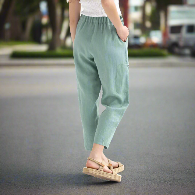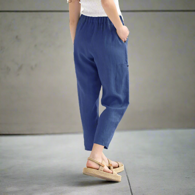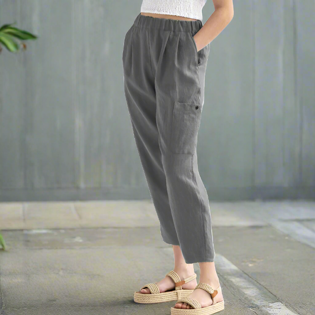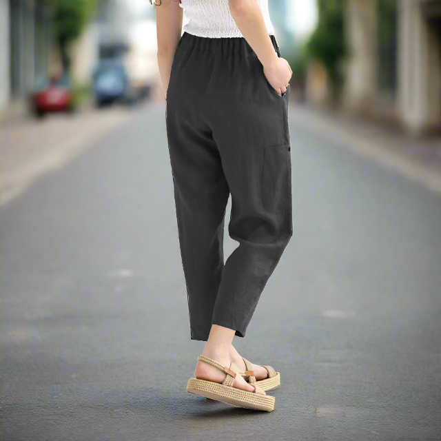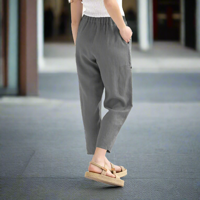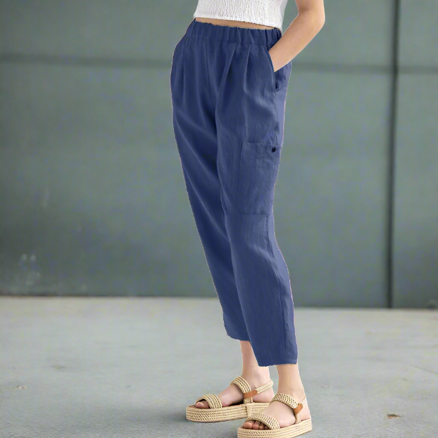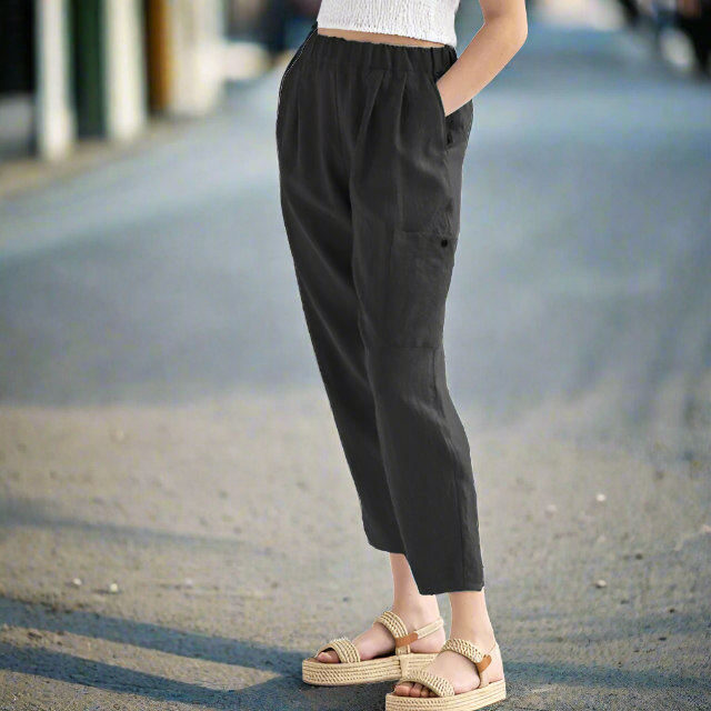 Wichtige Details sind eine praktische Seitentasche mit Klappe, die das Mitführen kleiner Essentials erleichtert. Die leicht verkürzte Länge sorgt für eine moderne Silhouette, die gut zu Sandalen, Sneakers oder Loafers passt, was diese Hosen zu einer klugen Wahl für verschiedene Anlässe macht.