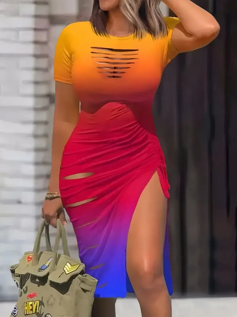Machen Sie eine kühne Aussage mit unserem auffälligen Bodycon-Kleid, das ein einzigartiges Ombre-Design aufweist, das nahtlos leuchtende Gelb-, Orange-, Rot- und Lila-Töne verbindet. Dieses figurbetonte knielange Kleid betont Ihre Kurven und sorgt gleichzeitig für eine bequeme Passform, die sich mit Ihnen bewegt.