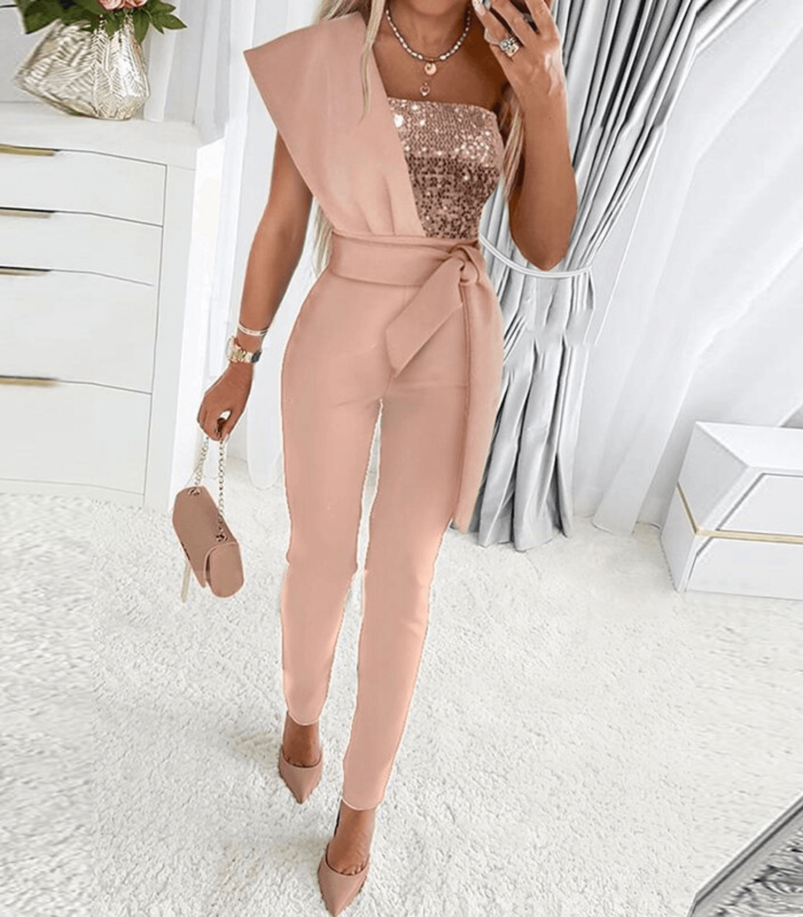 Entdecken Sie die Welt der Eleganz mit unserem atemberaubenden Pailletten Patchwork-Overall. Dieses Stück ist darauf ausgelegt, bei jedem Event ein Statement zu setzen. Der Overall verfügt über eine nahtlose Mischung aus schimmernden Pailletten auf dem Oberteil, die den weichen, pastellfarbenen Stoff, der sich elegant über den Rest der Figur legt, perfekt ergänzen.
