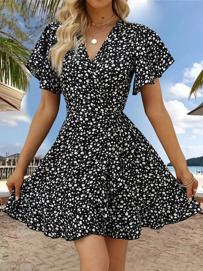 Durch das schmeichelhafte Wickeldesign wird dieses Kleid an der Taille mit einer Seitenschleife gebunden, sodass Sie die Passform nach Belieben für ganztägige Leichtigkeit und Eleganz anpassen können. Der verspielte, ausgestellte Rock tanzt knapp über den Knien und eignet sich perfekt für eine Vielzahl von Anlässen, von Strandbesuchen bis hin zu lässigen Treffen mit Freunden.