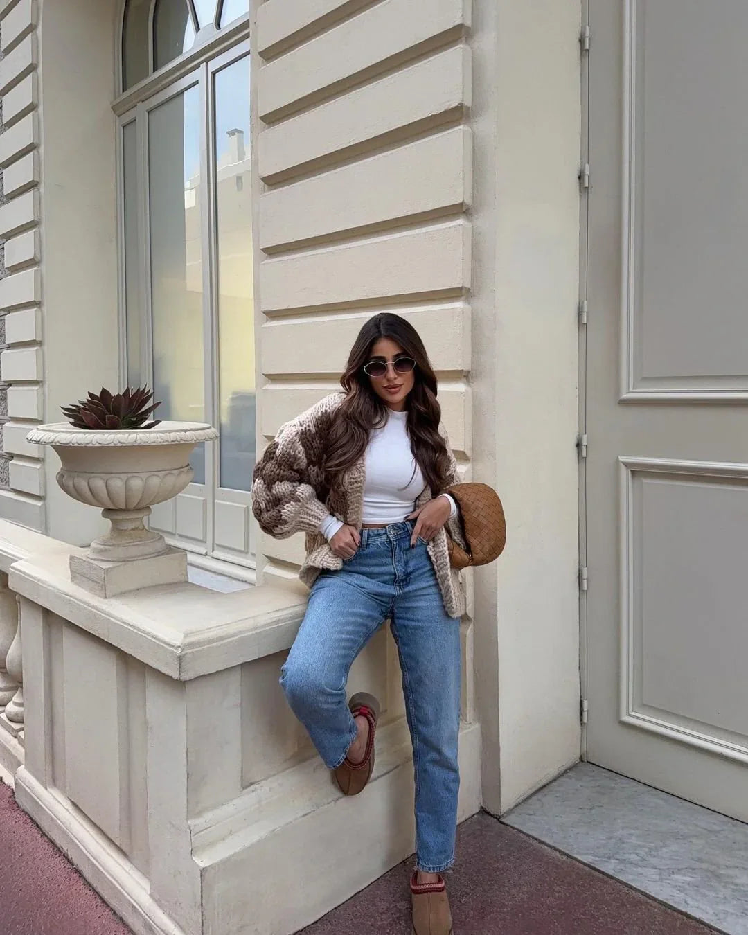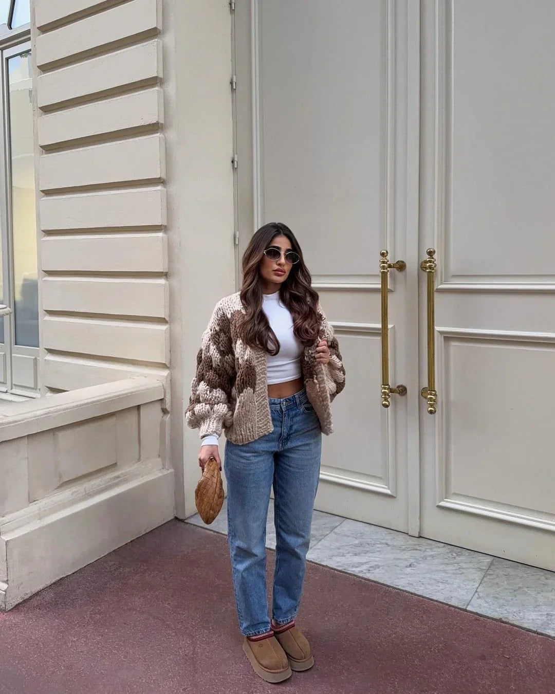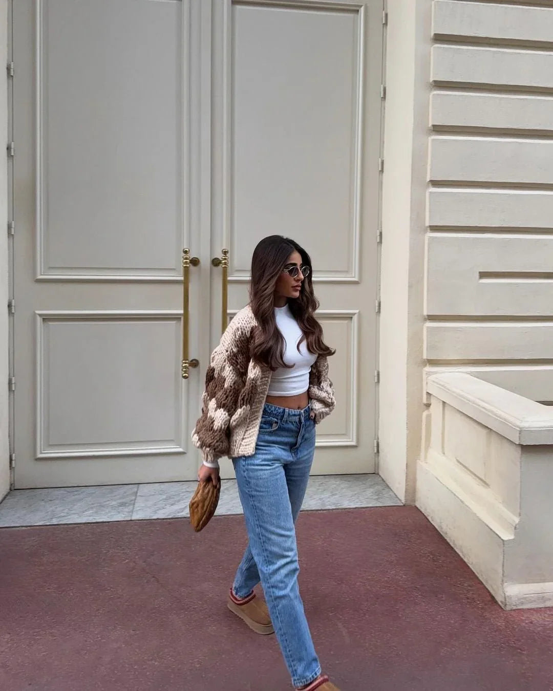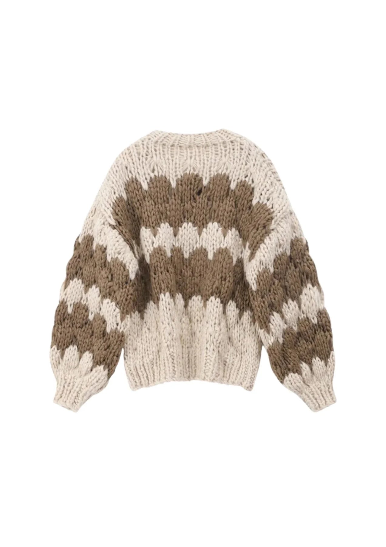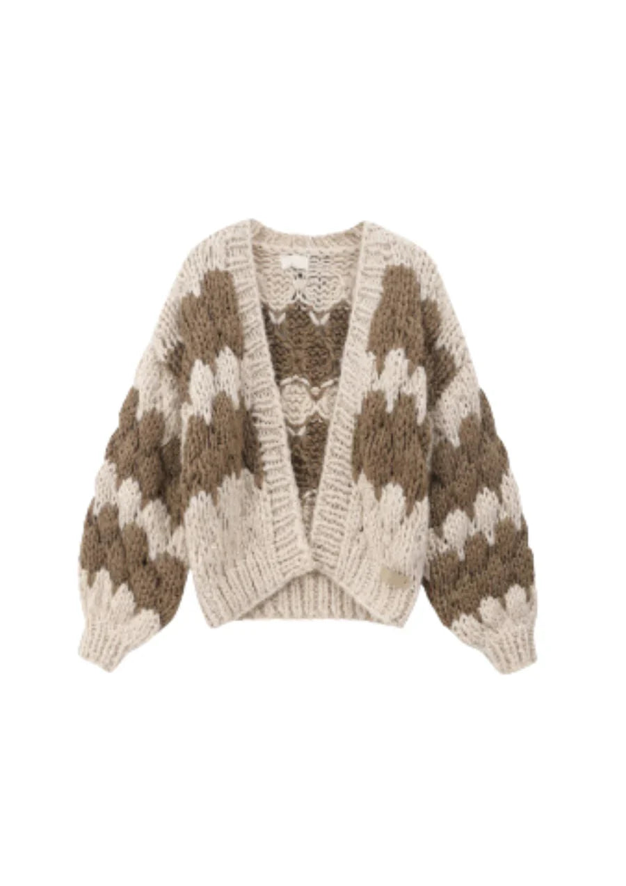 Diese cremefarbene und braune Strickjacke gehört zu unseren Bestsellern und ist ideal, um Ihrer Garderobe einen Hauch von Stil und Weichheit zu verleihen. Mit Puffärmeln und einem Streifenmuster ist sie perfekt für jede Gelegenheit und kombiniert Komfort und Stil.