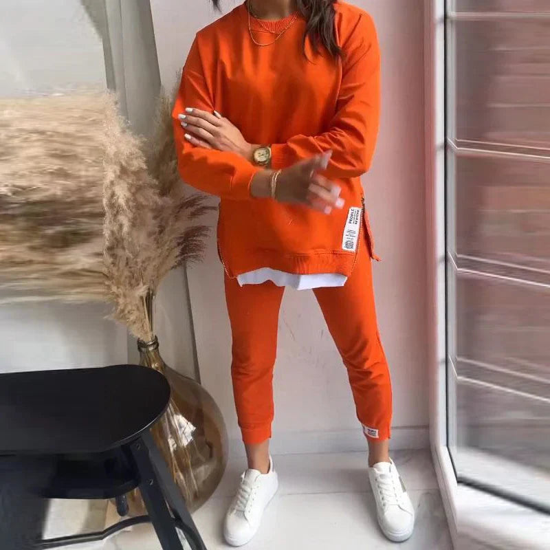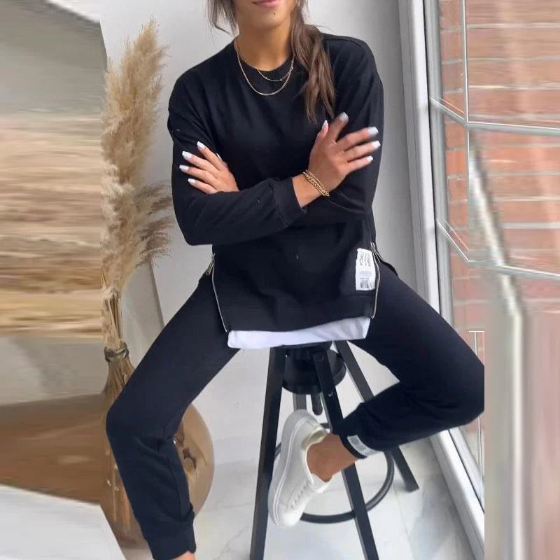 Verbinden Sie Eleganz und Komfort im Alltag mit dem Set Élise. Entworfen für moderne Frauen, kombiniert es einen langärmligen Pullover mit fließendem Fall und eine schmal geschnittene Hose mit bequemer Taille. Ein vielseitiger Look, der sowohl zuhause als auch unterwegs getragen werden kann.