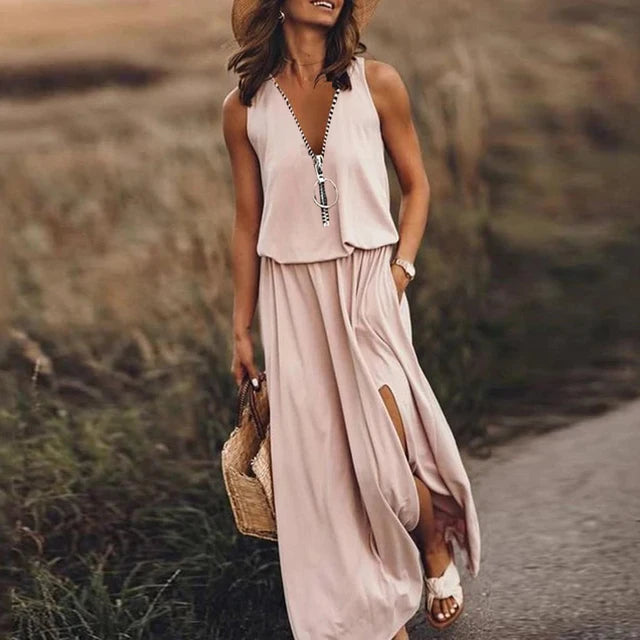 Stell dir vor, du gehst an einem sonnigen Nachmittag spazieren, fühlst dich selbstbewusst und strahlst pure Eleganz aus. Dieses auffällige ärmellose Kleid umhüllt dich mit weicher Luxusqualität und lässt gleichzeitig deine einzigartige Persönlichkeit erstrahlen – perfekt für warme Tage, Stadtbummel oder entspannte Treffen an sommerlichen Abenden.