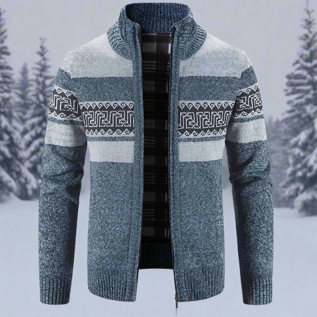 Umarmen Sie diesen Winter gemütliche Eleganz mit unserem Strickpullover mit Reißverschluss. Entworfen für Komfort und Stil, zeichnet sich dieser Pullover durch eine schlanke, moderne Silhouette aus und ist mit einem einzigartigen geometrischen Muster verziert, das einen Hauch von Raffinesse verleiht.