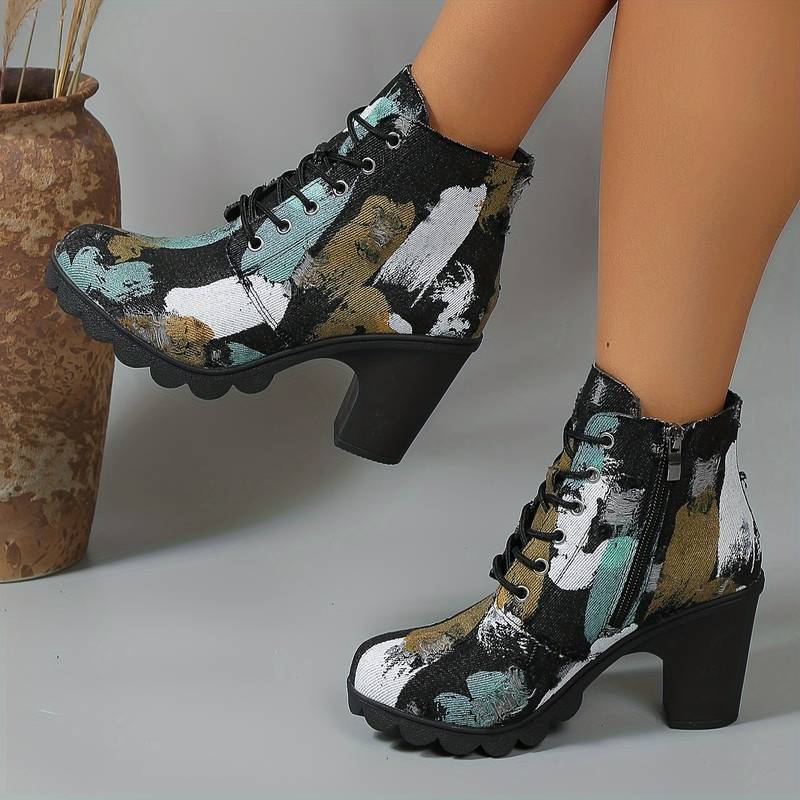 Handgefertigte Stiefeletten mit abstraktem Muster und klobigem Absatz für Damen
