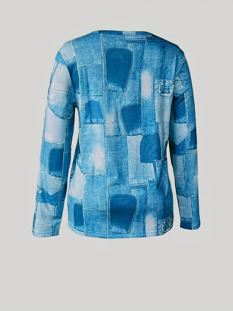 Verleihen Sie Ihrer Freizeitgarderobe mit diesem schicken Patchwork-Denim-Langarm-Top einen Hauch von Chic. Dieses Langarm-Top, gefertigt aus atmungsaktivem, hochwertigem Stoff, vereint Stil und Komfort mühelos. Mit seinem einzigartigen Patchwork-Denim-Muster in verschiedenen Blautönen strahlt es eine moderne, trendige Atmosphäre aus, die in jeder Menge auffällt.
