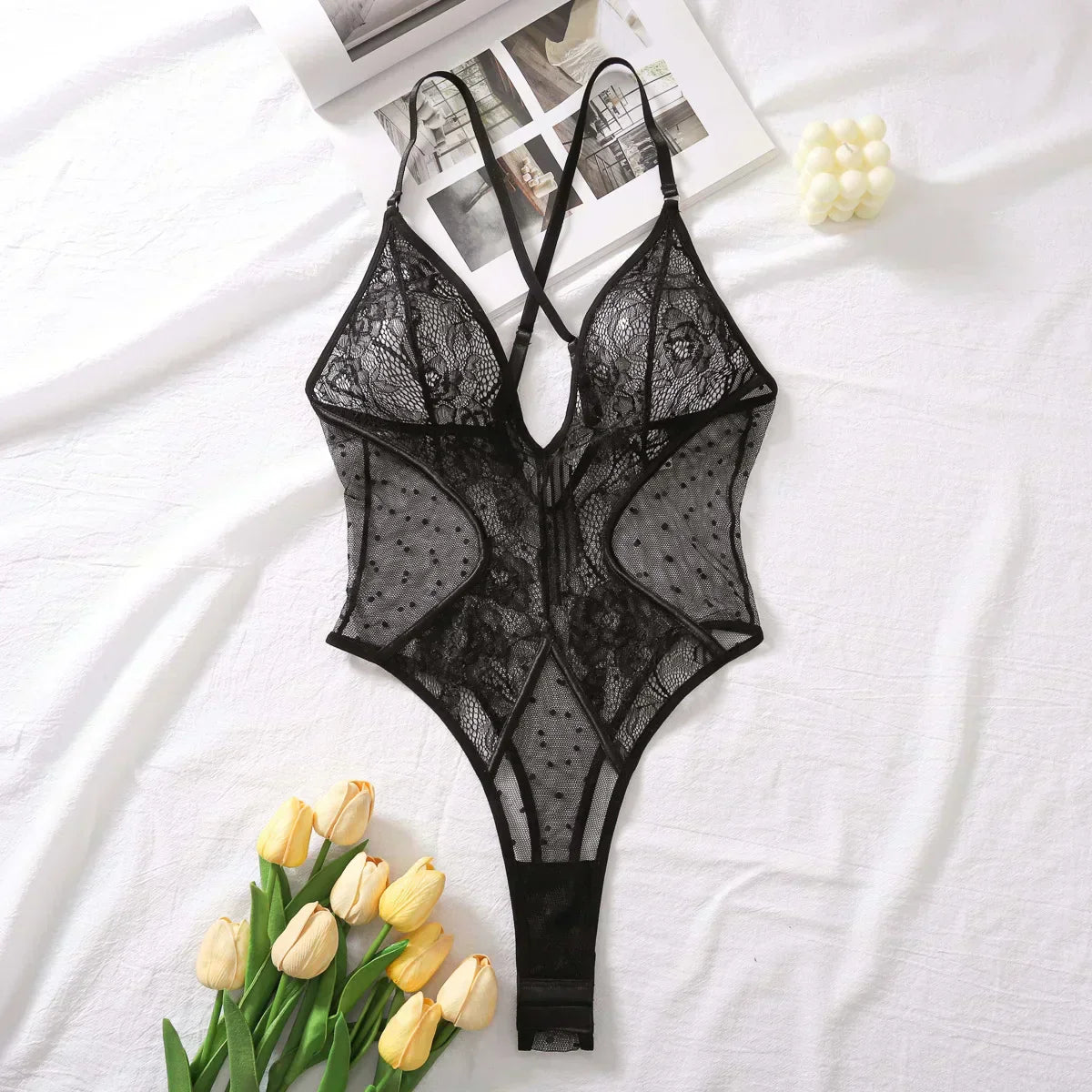 Der Kim-Body ist die perfekte Balance zwischen Eleganz und Sinnlichkeit. Die luxuriöse Spitze kombiniert mit transparentem Mesh und dezenten Punktedetails sorgt für einen unwiderstehlichen Look. Mit dem tiefen V-Ausschnitt und der figurnahen Passform fühlst du dich selbstbewusst und stilvoll.