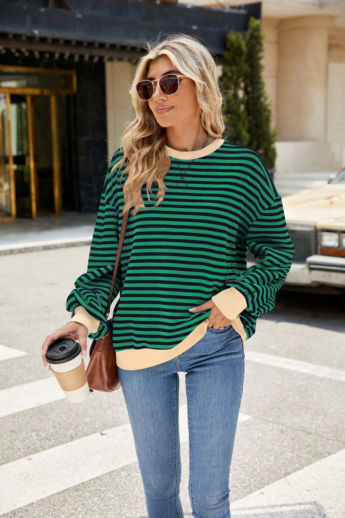 Perfekt für jeden Anlass kombiniert dieser Pullover mühelosen Chic mit gemütlichem Komfort. Das auffällige Streifendesign und die kontrastierenden Randdetails verleihen ihm eine verspielte, moderne Note, wodurch er ein vielseitiges Stück ist, das sich problemlos von entspannten Tagen zu stilvollen Abenden wandelt. Die Drop-Ärmel sorgen für eine entspannte Silhouette, die sowohl Bewegungsfreiheit als auch modische Anziehungskraft bietet.