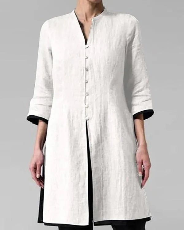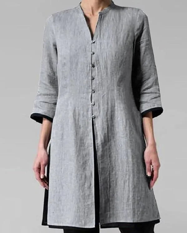 Entdecken Sie mühelose Eleganz mit unserer Tunika aus Leinen. Dieses vielseitige Stück ist sowohl komfortabel als auch stilvoll, perfekt für Übergangswetter. Die Tunika besticht durch eine schmeichelhafte Länge bis zur Mitte der Oberschenkel, einen ordentlichen Stehkragen und eine durchgehende Knopfleiste, die einen Hauch von zeitloser Raffinesse verleiht.
