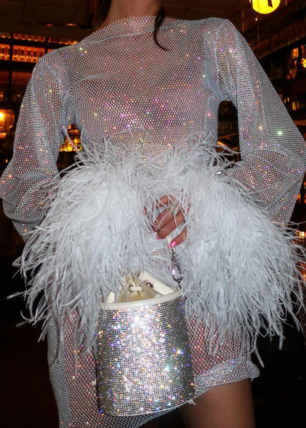 ODESSA | Metallisches Minikleid mit Transparenten Bündchen und Federn