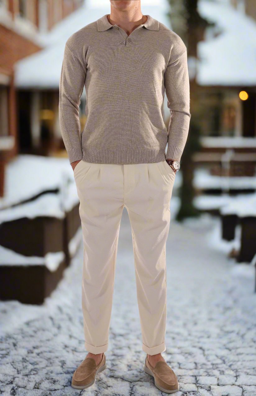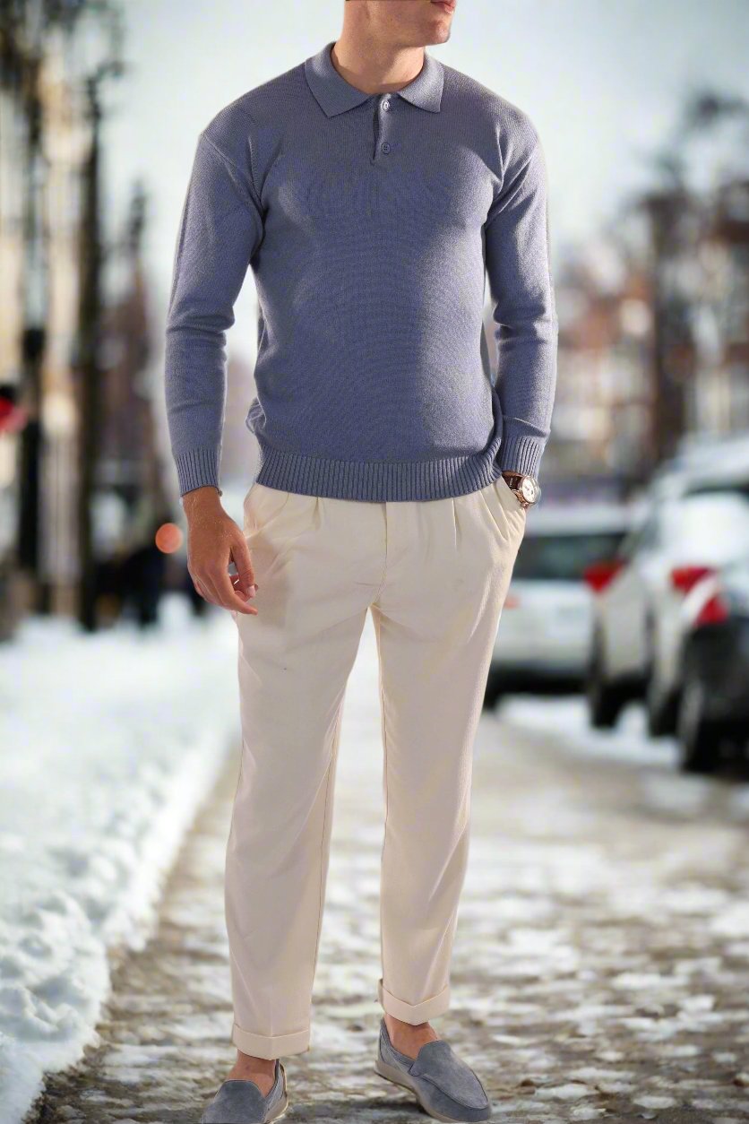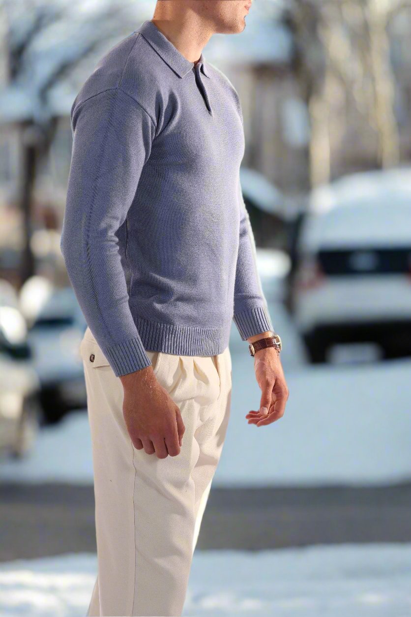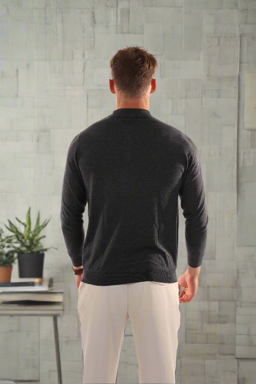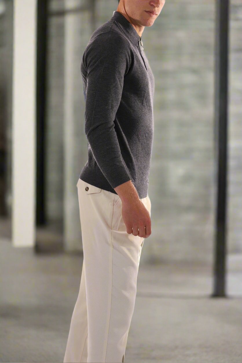 Es zeichnet sich durch einen klassischen Polokragen und eine stilvolle Knopfleiste aus, die Eleganz mit lässigem Charme verbindet. Der maßgeschneiderte Schnitt betont die Silhouette und bietet gleichzeitig Bewegungsfreiheit. Ideal zum Kombinieren mit maßgeschneiderten Hosen für einen smart-casual Look oder Jeans für eine entspannte Atmosphäre.