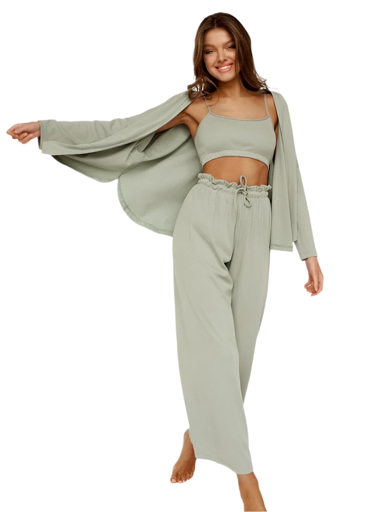 - 3-teiliges Set: Enthält eine offene Bluse, ein Tanktop und Hosen mit elastischem Bund für einen koordinierten Look