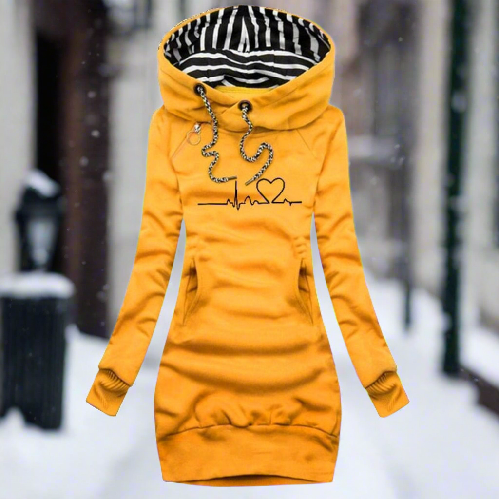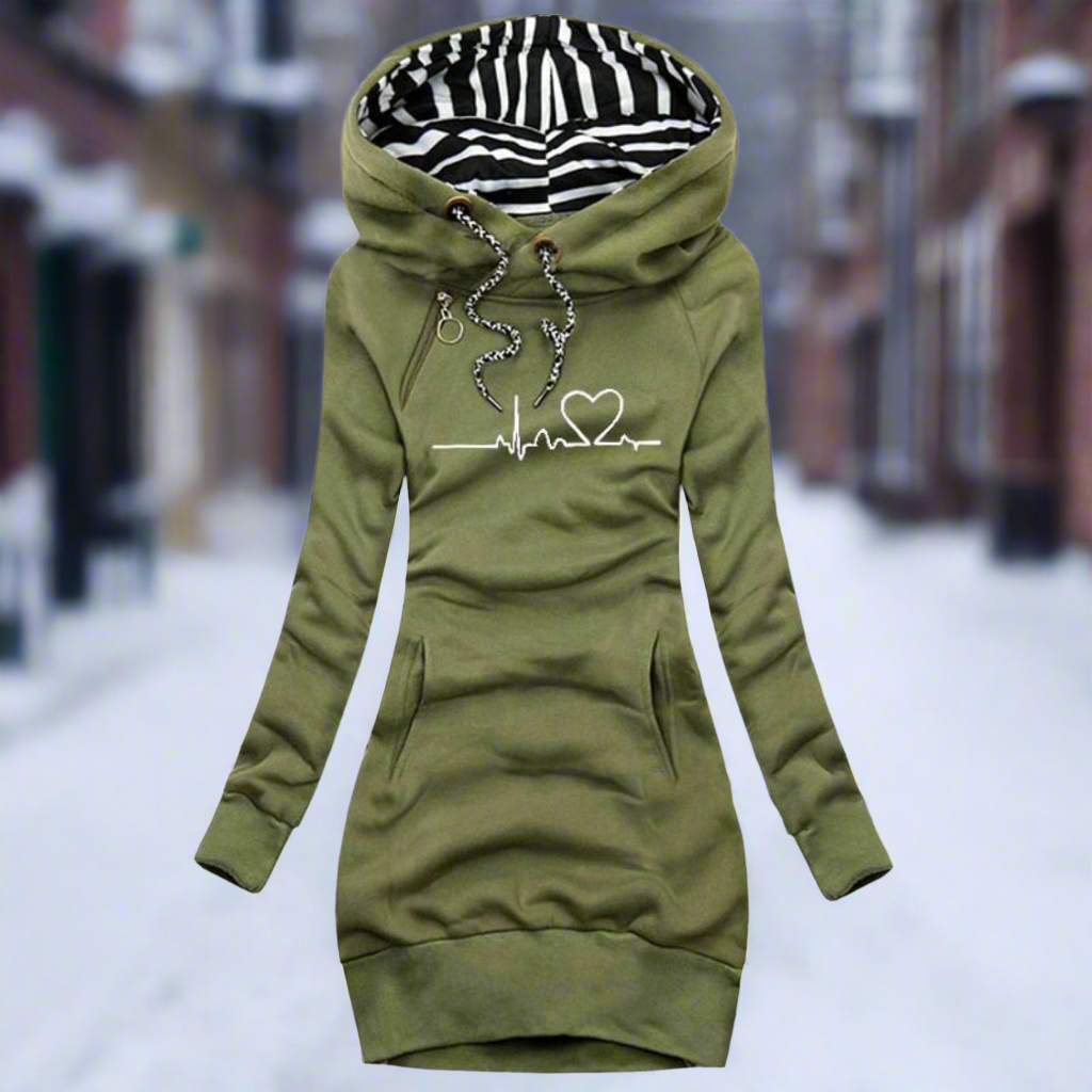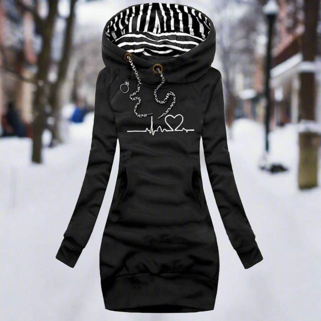 Erhöhen Sie Ihren lässigen Stil mit unserem trendigen Heartbeat Hoodie Kleid. Dieses Kleid besticht durch ein schlankes Design, hervorgehoben durch eine spielerische Herzschlag-Grafik, die Vitalität und Liebe symbolisiert.