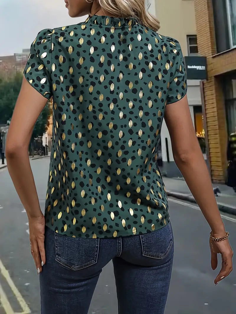 Die Bluse ist für eine schmeichelhafte Silhouette zugeschnitten und verfügt über kurze, leicht gepuffte Ärmel, die sowohl Komfort als auch Stil bieten. Der V-Ausschnitt verleiht einen Hauch von Raffinesse und lässt sich leicht mit Ihren Lieblingsketten und Schmuckstücken kombinieren.