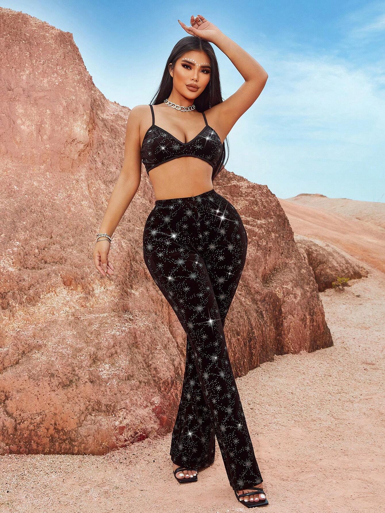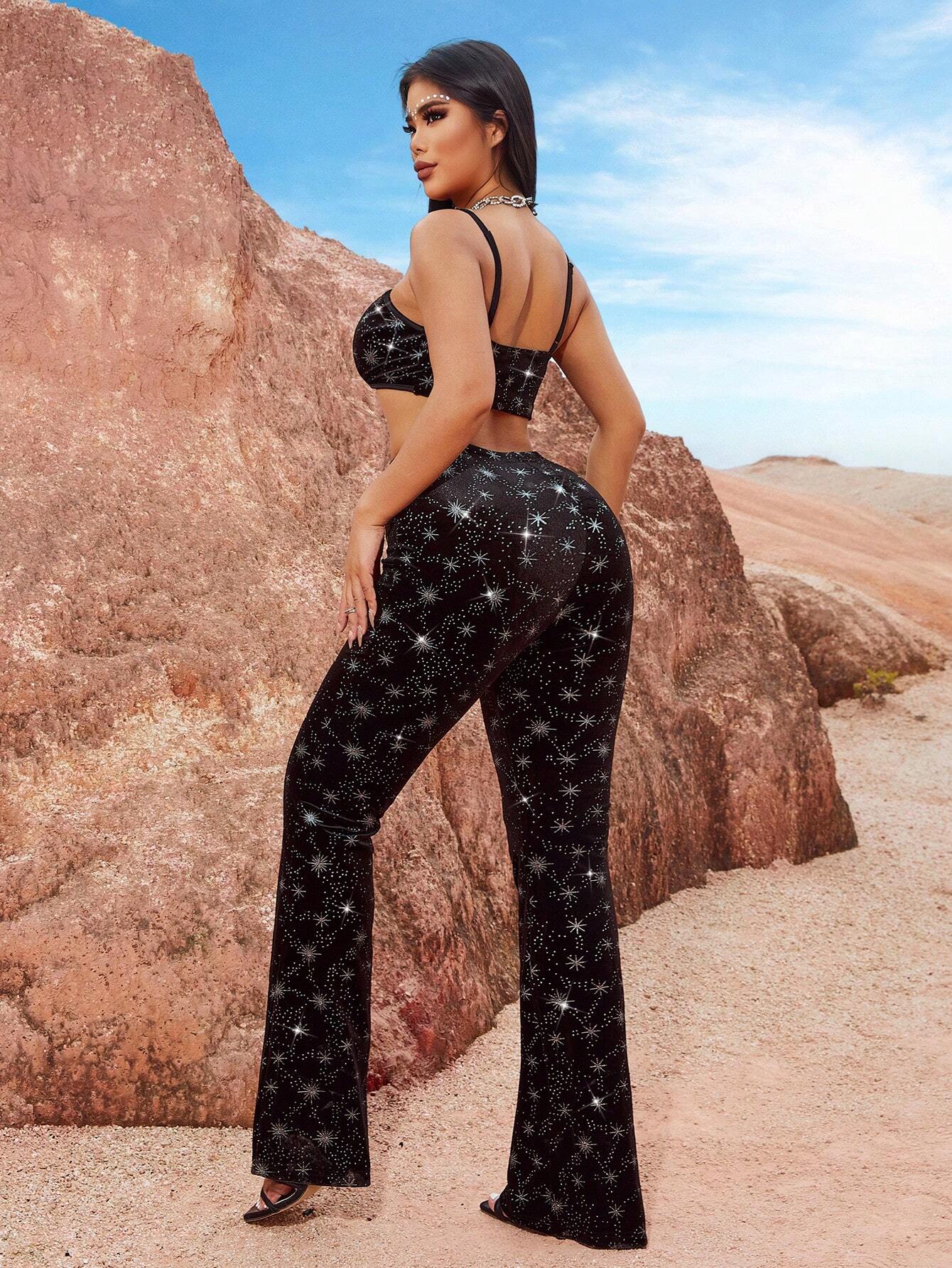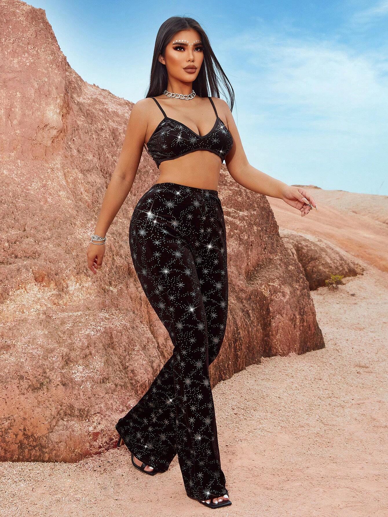 Erheben Sie Ihren Stil mit unserem Stellar Velvet Two-Piece Set, das für die mutigen und modebewussten entworfen wurde. Dieses atemberaubende Ensemble verfügt über ein schickes Bralette mit zarten Sternverzierungen, die glamouröse Vibes ausstrahlen, die perfekt für jede Nacht sind.